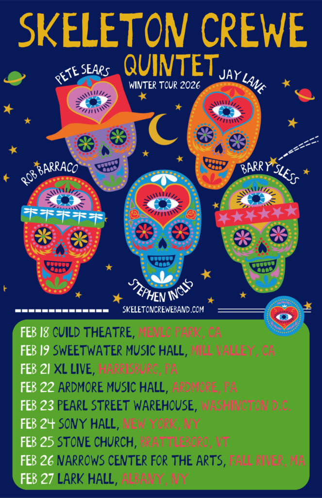 The worlds of Hawaiian slack key guitar, psychedelic pedal steel, masterful keyboard, bass & drum work converge as five virtuosos of the jam band scene announce the formation of Skeleton Crewe. Born from a serendipitous collaboration in early 2024, this unique musical collective features Rob Barraco (Dark Star Orchestra, Phil Lesh & Friends, The Dead), Barry Sless (Bobby Weir and Wolf Bros, David Nelson Band, Phil Lesh and Friends), Grammy-nominated Hawaiian slack key guitarist Stephen Inglis (Billy Kreutzmann), Pete Sears (Jefferson Starship, Hot Tuna, Phil Lesh & Friends, David Nelson Band) & Jay Lane (Dead & Company, Bobby Weir & Wolf Bros, Ratdog)